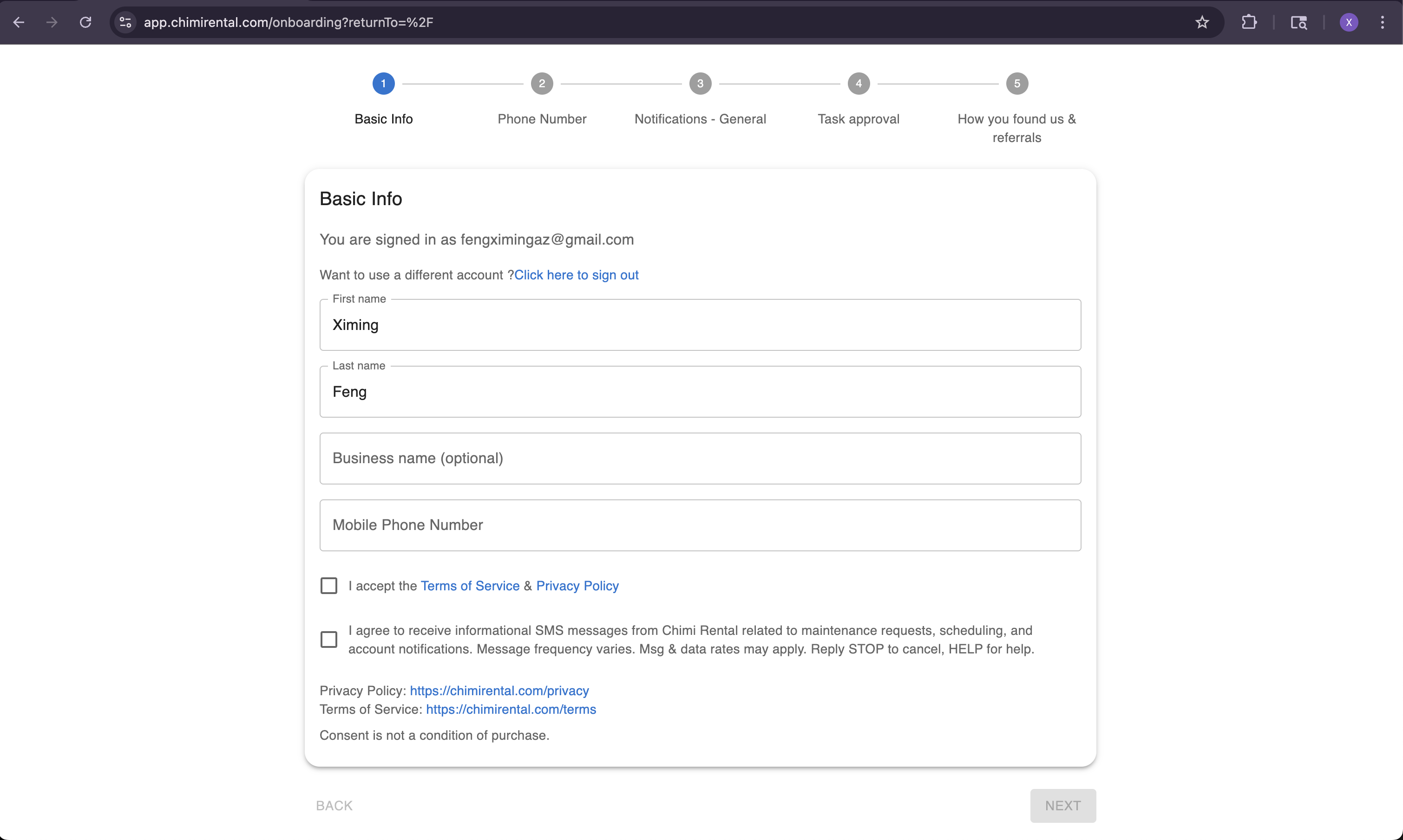Users create an account at https://app.chimirental.com using email/password or social login and are then taken to a required onboarding flow before accessing the application. During onboarding, users provide their phone number and explicitly opt in to receive SMS messages by checking an unchecked, required SMS consent checkbox before any messages are sent.